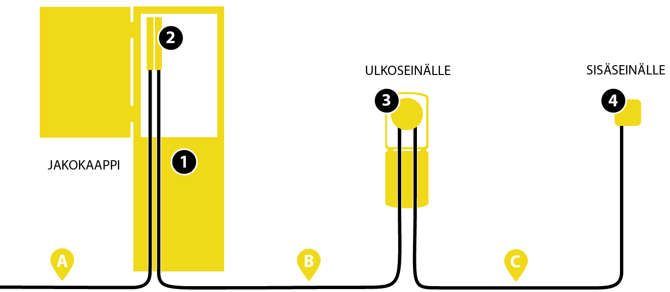 A: Runkokaapeli yhdellä tai kahdella liittimellä; B: Tilaajakaapeli yhdellä tai kahdella liittimellä; C: Kytkentäkaapeli sisä-/ulkokäyttöön